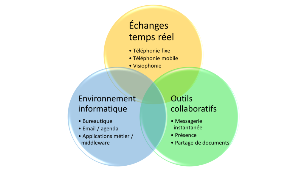 Une première définition des Communications unifiées, que l’on peut qualifier d’encyclopédique, les désignent comme : un ensemble de services permettant d’assembler étroitement (d’où le terme « unifiées ») ces trois domaines :