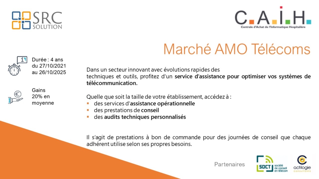 Le marché AMO Télécoms de la CAIH a été attribué depuis le 27 octobre 2021 à SRC Solution et ses partenaires SDCT et Actilogie.